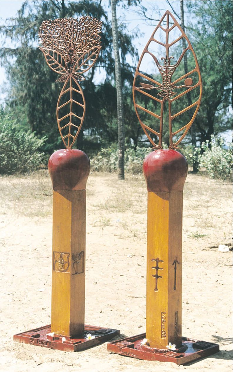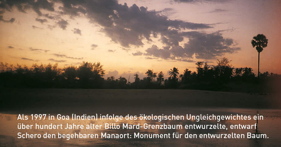 Der metaphysische Leib des Urbaumes vibriert in einem hölzernen Schlagstock ebenso wie im Holzlöffel, den wir beim Abschmecken der Speise zum Mund führen; er ist gewaltig in den Bildnissen der Wälder und prächtigen Landschaften und als das gute Holz auf Still-Gemälden gegenwärtig. Der musiktönende Baum, dieses lebensbewährte Instrument, läßt das Echo des Waldes erklingen, die junge Schonung und das erkrankte Holz. Holzzunge und Klangkörper fühlen, wie es um uns bestellt ist. In der französischen Sprache gibt es kein Synonym für das Sterben der Wälder; also bedient sie sich der zusammengesetzten deutschen Stämme Wald und Sterben. Wobei sie aus Gründen der Selbstbetroffenheit den ARTikelschutz wahrt, kurz, sie mahnt die Welt mit dem Dreiklang Le Waldsterben. Die sterbenden Wälder - der Baum, ist das Kreuz unserer Kultur, in vielfacher Hinsicht. Ohne Bäume können wir nicht mehr atmen oder Blätter bedrucken; und Bäume ohne Blätter spenden keinen Schatten. Im Lande des Tathagatas und Mahatma, in Bharat-India, hängen Gebetsfahnen in den Baumwipfeln und weihen die Landschaft mit einem Netz beschützender Mantren. Zugleich werden Wälder abgeholzt, Bäume ihres Laubes beraubt werden, um als Brennholz und den Tieren zum Fraß zu dienen. Auf zornigen Bergrücken stehen heute surreale Gestalten, abgestorbene Bäume, ohne Krone und Lied. In Walt Withmanns Grasharfe heißt es: „Ich singe mich selbst.“ Tagore gab uns auf den Weg: Gott achtet Dich, wenn Du arbeitest, aber Gott liebt Dich, wenn Du singst. Während sich Hieronymus Boschs Vision Garten der Lüste als Anbeginn der modernen Traumdarstellung betrachten läßt, symbolisierte C.David Friedrichs Lebensbaum die romantische Meditatio und die Bedeutungs Perspektive pantheistischer Stille, den poetischen Raum sich offenbarender Natur. Und Gautama Buddha, der Tathagata, der Sogekommene, hatte in Bodhgaya unter der Ficus religiosa seine Erleuchtung erfahren.